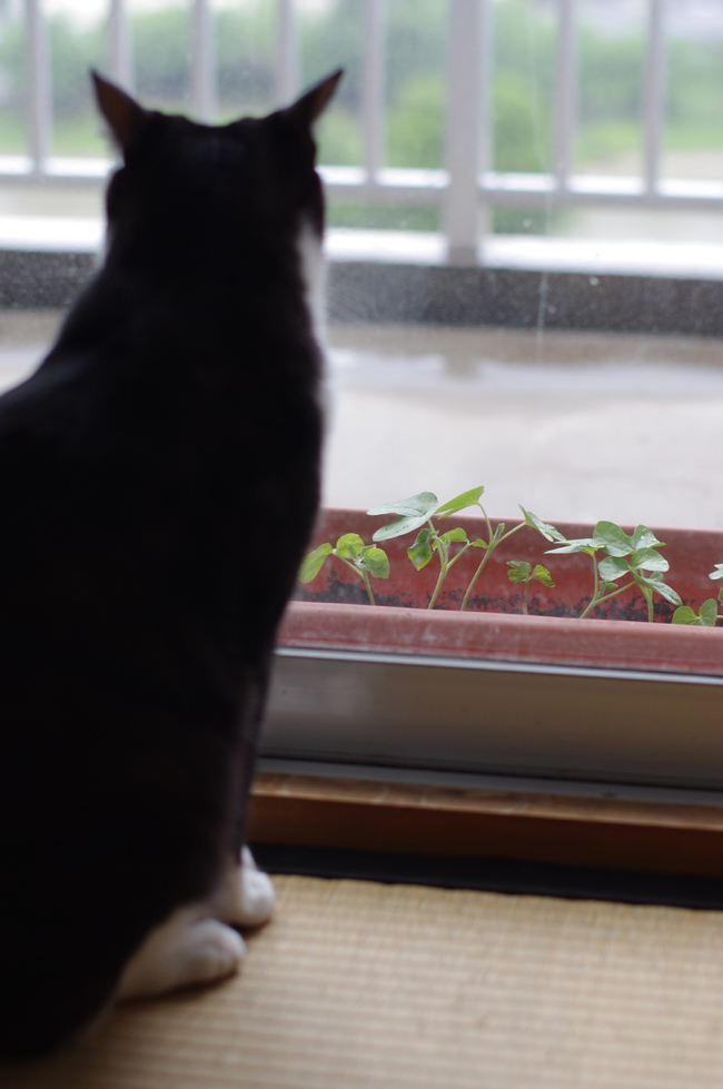 部屋の中から朝顔を見守る?ちっちくん。