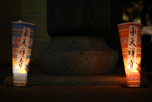 灯明の向こうに見えるのは 何やら会話をしているお坊さん