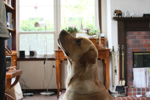 フードコントロールで遊び中のラブちゃん