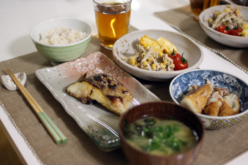 カンパチの塩焼き、卵焼き、ごぼうツナコーン、ちくわと豚肉の煮物。