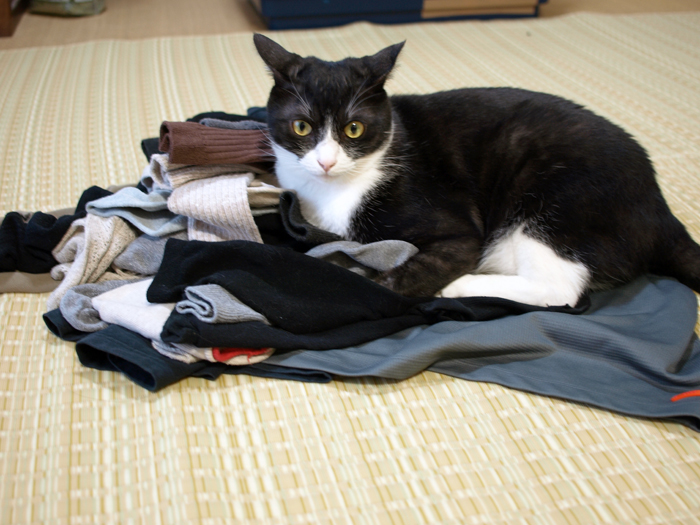 取り込んだばかりの洗濯物の上に