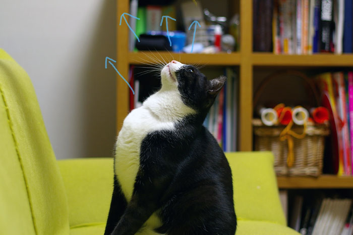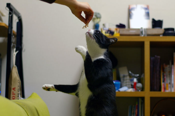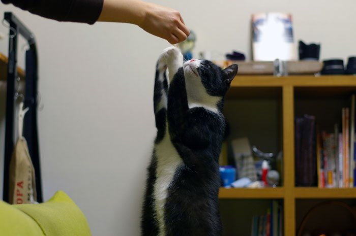 ねえ。ちっちくん。 いい物 あげよう。 ヒゲを上に向けて 全神経を それに 集中!! こっこれは!! くんくん・・・・・。 わしっ!! まんぞくにゃ~・・・・。 大好物の『かつおぶし』を使って 遊んでみました。