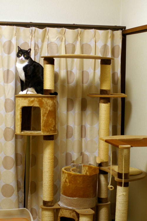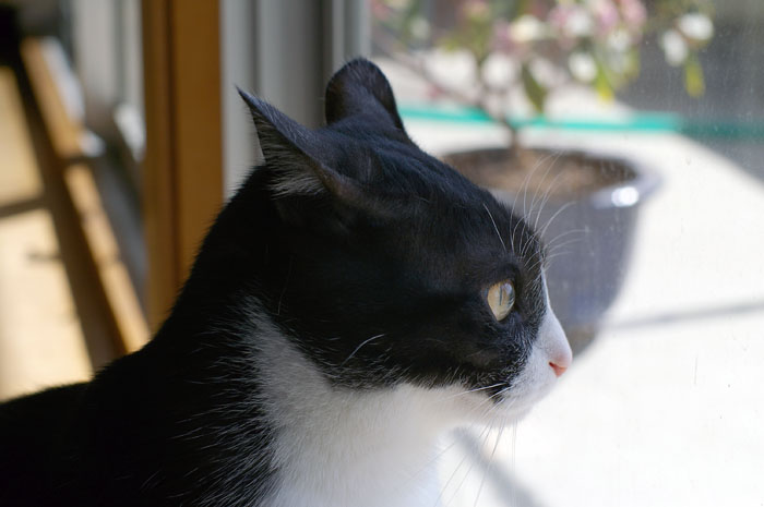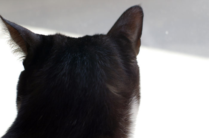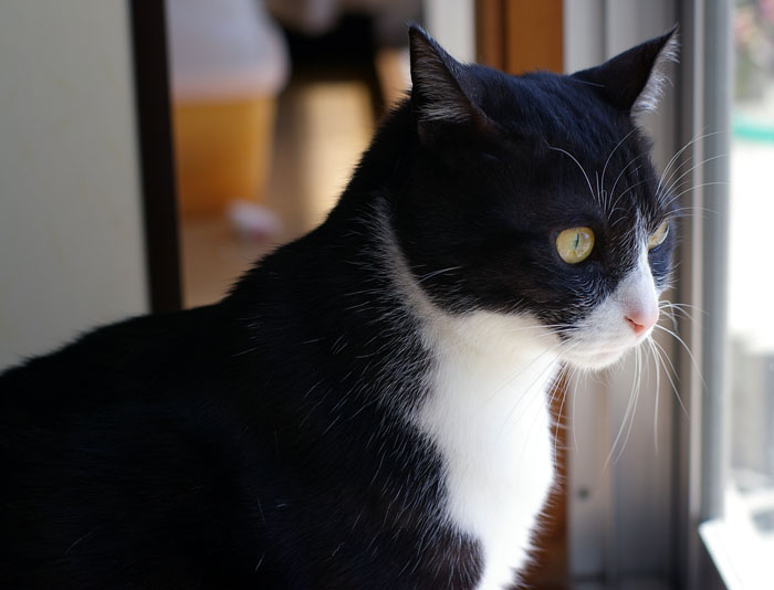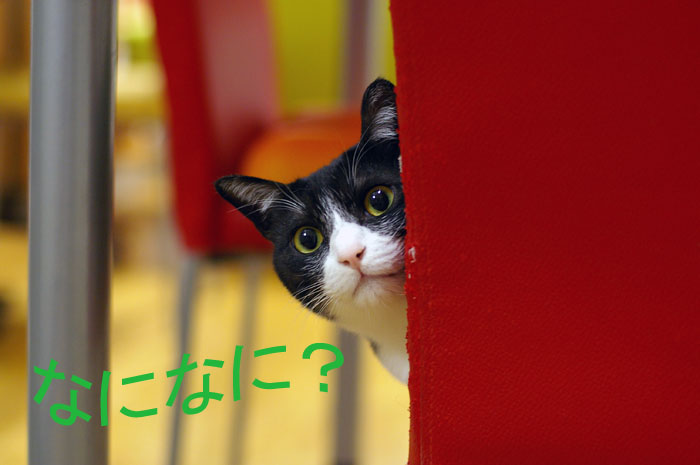自分の席から 顔を出し、キッチンにいる私を見つめています・